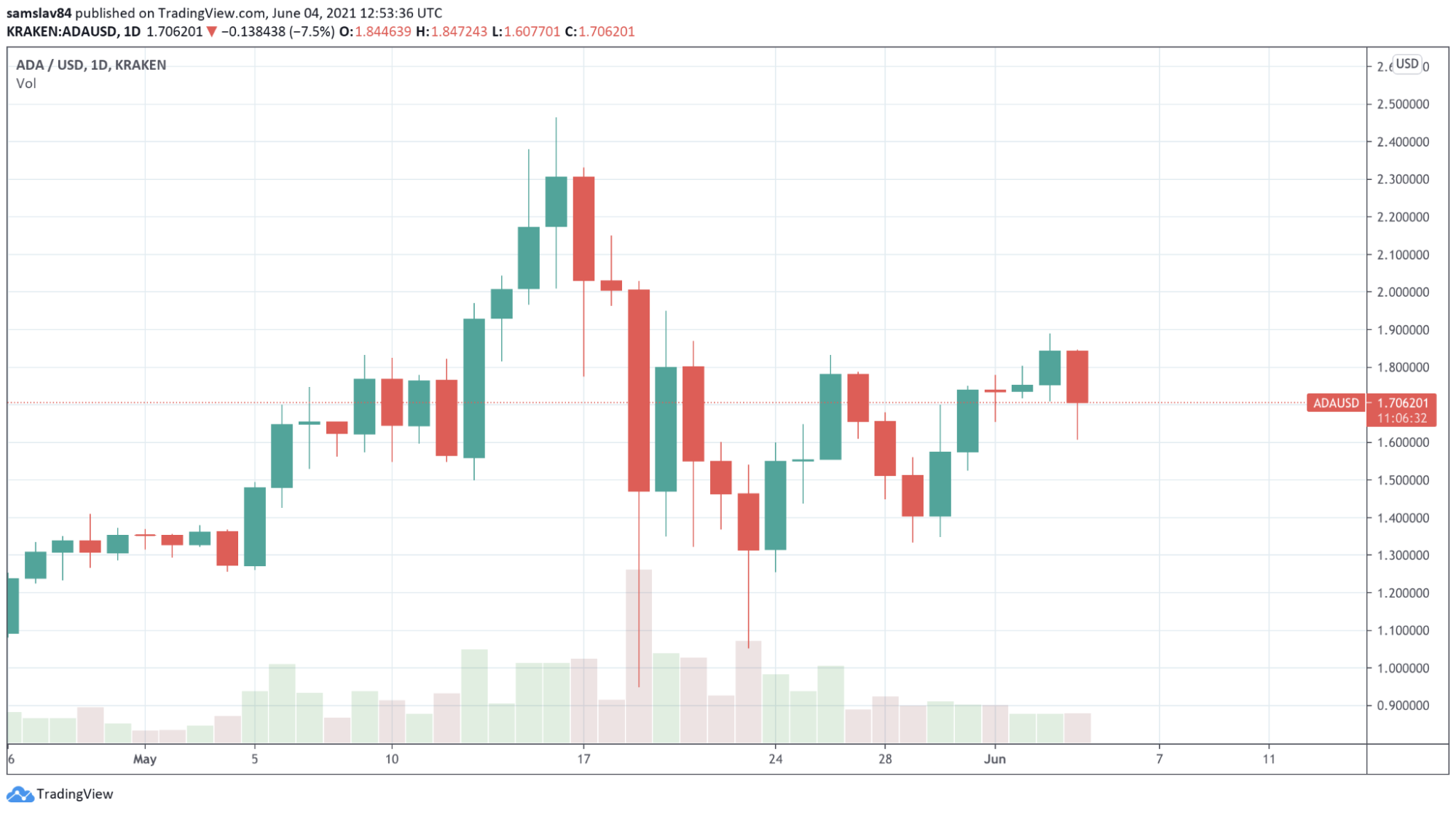 Podobně, jako většina kryptoměn i Cardano v květnu 2021 dosáhlo nové historické maxima. Chvíli se obchodovalo za 2,45 USD!